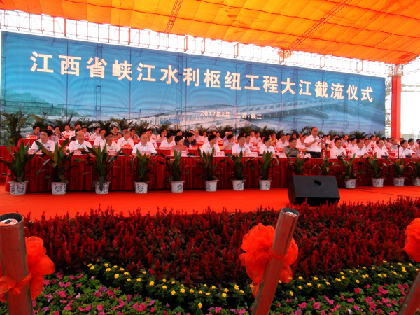 截流儀式由省委常委、常務(wù)副省長凌成興主持。10時16分,省長鹿心社宣布大江截流開始,10時29分,隨著最后一車石料投入江中,三期圍堰成功合龍后,省委書記蘇榮鄭重宣布:“峽江水利樞紐工程大江截流成功”。