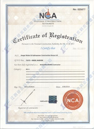 2013年3月份,肯尼亞國家建筑局(National Construction Authority)發(fā)出公告,要求所有在肯尼亞的建筑企業(yè),必須在肯尼亞建筑局注冊(cè)登記,提交相關(guān)資料,評(píng)出公司資質(zhì)等級(jí)。
