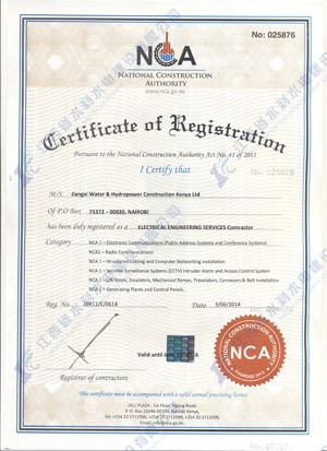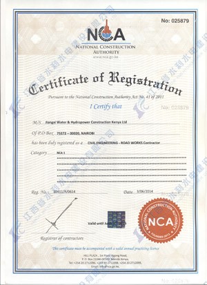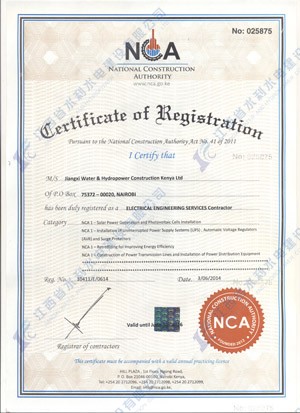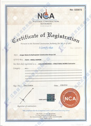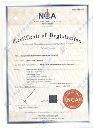 江西省水利水電建設(shè)有限公司肯尼亞分公司接到通告后,積極準(zhǔn)備相關(guān)資料,憑借公司的技術(shù)實(shí)力和肯尼亞市場(chǎng)的良好業(yè)績,最終取得所有六項(xiàng)的一級(jí)證書。其中包括:水利施工一級(jí),公路工程施工一級(jí),房屋建筑工程施工一級(jí),結(jié)構(gòu)施工一級(jí),電力工程施工一級(jí)和機(jī)電工程施工一級(jí),有力地提升公司的品牌影響,提升了公司資信競爭力,為公司在肯尼亞各項(xiàng)工作的全面深入開展創(chuàng)造了積極有利的條件。