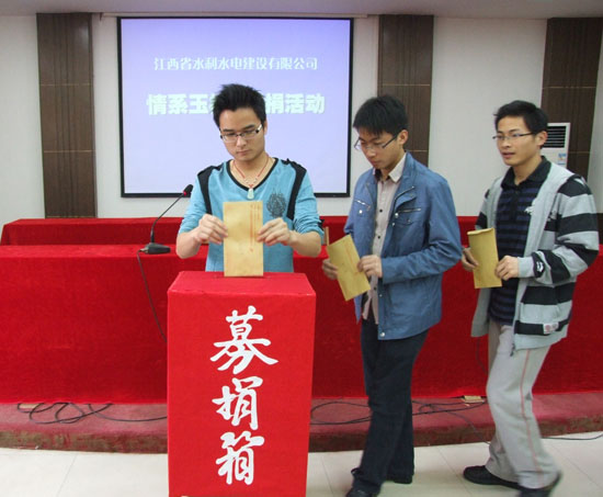 2010年4月14日,青海省玉樹縣發生兩次地震,最高震級7.1級,造成了當地巨大的人身傷亡和財產損失,“玉樹地震”牽動著億萬人民的心,也牽動著我司所有員工的心!公司在全司范圍內積極開展“情系玉樹募捐活動”,4月26日,我公司南昌市機關總部首先開展了“情系玉樹募捐活動”,公司中層以上管理人員和員工踴躍參與募捐活動,紛紛獻上自己的一份愛心,體現出江西水總人的社會責任感!同時,各分公司、國內外施工項目部也在開展此項活動,預計此項活動將募得資金3萬余元。