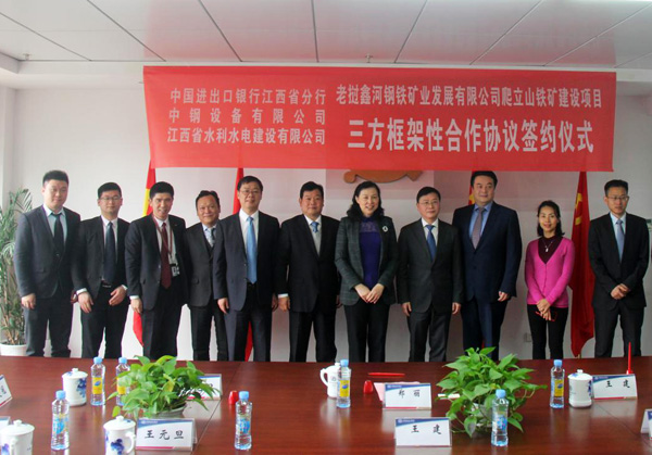 12月29日上午,在江西省商務廳副廳長方向軍、外經處處長王健的見證下,公司與中國進出口銀行江西省分行和中鋼設備有限公司就老撾鑫河鋼鐵礦業發展有限公司爬立山鐵礦建設項目正式簽訂三方框架性合作協議。中國進出口銀行江西省分行行長鄭麗、中鋼設備有限公司總經理王建、公司董事長王元旦、海外公司總經理黃鄭民等出席簽約儀式。