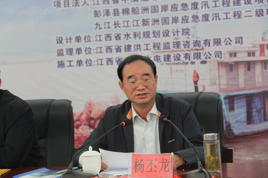 省水利廳副廳長楊丕龍在會上作了重要講話,他對九江長江江心洲固岸應急度汛工程棉船洲1標和江新洲1標進展予以充分肯定,并代表省水利廳黨委向有關單位和部門對水利建設的關心和支持表示衷心感謝,向奮戰在固岸應急度汛工程建設一線的參建各單位和工作人員表示親切慰問。