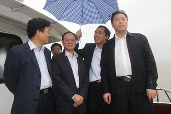 9月29日,省河湖局在彭澤縣組織召開了九江長江江心洲固岸應急度汛工程項目驗收會議,由劉曉明副局長主持。9月30日上午,按照會議日程,參加驗收會的各單位代表乘坐快艇前往棉船洲1標復排段砌石護岸完工段察看工程情況。彭澤縣下起了大雨,長江江面陣風達到六級,省水利廳、省發改委、九江市政府、省水利廳有關處室及有關單位負責人,九江市水利局等有關單位領導不顧船身搖晃和瓢潑大雨,來到船舷及甲板上察看工程并聽取有關情況匯報,對我公司發揚善打大仗、敢打硬仗的精神,科學組織,勇往直前,夜以繼日,連續作戰,上足施工設備,充實利用長江江面間斷睛好天氣搶工期,保證了工程的順利完工,并在今年長江汛期發揮有效的防洪保安作用,給予了充分肯定。